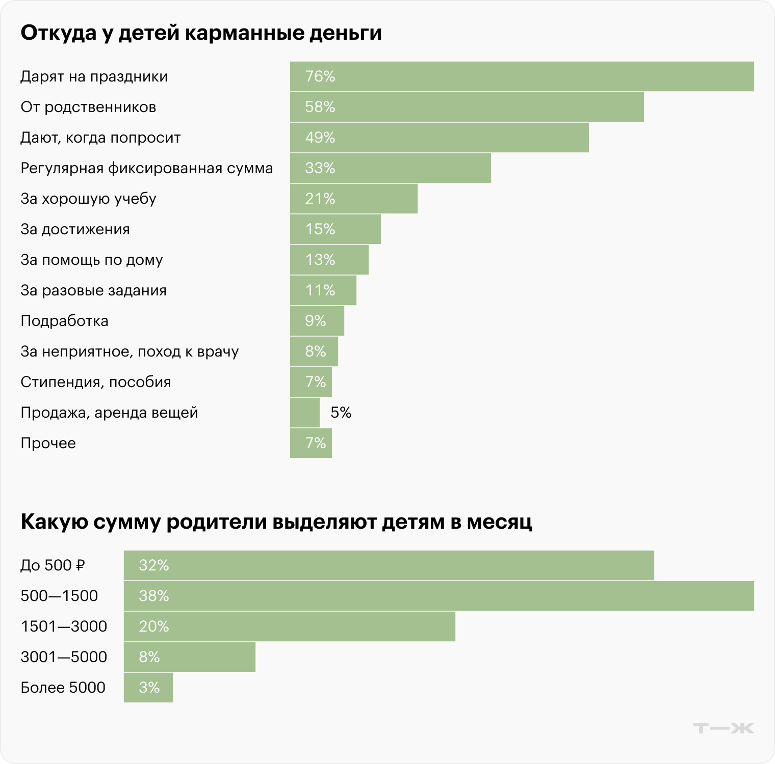 Большинство россиян, а именно 85%, дают своим детям деньги на карманные расходы. Так, каждый третий полагает, что карманные деньги могут научить подрастающее поколение базовым экономическим навыкам, а каждый десятый считает, что это может способствовать развитию навыка накопления денежных средств. В среднем, россияне считают наиболее правильным начать давать детям карманные деньги с 9 лет. По мнению родителей в основном их дети тратят карманные деньги на покупку еды/ продуктов питания (32,8%), оплату транспорта (12,5%), компьютерные игры и развлечения (11,9%) и сотовую связь (4%).